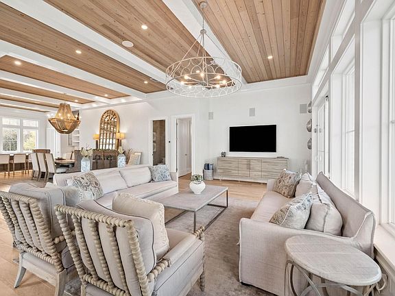 Just off the second-floor family room, doors open to a large elevated porch with a heated pool, lounge area, and fireplace. Offering the ultimate in outdoor living. In total, the home offers more than 1,000 square feet of porch and patio space, including a ground-level covered living area with a fireplace, an outdoor TV, dining space, and a fully equipped summer kitchen featuring a grill, sink, and mini fridge.