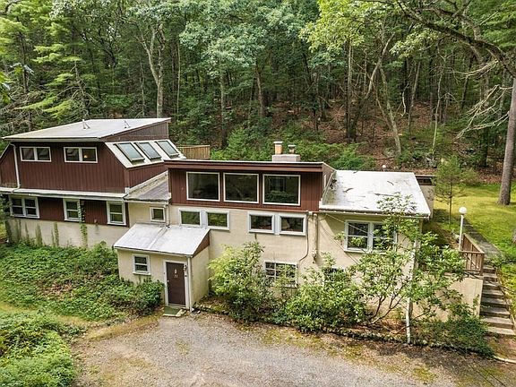 Here lies a rare opportunity for those who value land, privacy & natural surroundings, to invest in this 2600+ sf mid-century modern style home set on 4.36 lush and serene acres of land abutting Nobscot Mountain and Tippling Rock Conservation area with miles of hiking trails. A peaceful nature lovers retreat, yet close to all the modern conveniences. Featuring vaulted ceilings and large-scale windows for abundant natural light, as well as 3 bedrooms, 2 full bathrooms, an open-concept kitchen, large living room with vaulted ceiling & fireplace and a spectacular upper-level studio, the perfect space for creative endeavors or 2nd home office. Bring your plans & ideas to polish this gem or remove the home to make way for your own custom build. This home is being sold "AS IS". A 4 bedroom septic design will be provided. Buyer responsible for install. 4+ acres, cul-de-sac setting, privacy & convenient location in South Sudbury!