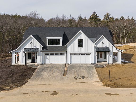 Welcome to Trails Edge located in the desirable town of Windham, New Hampshire! This stunning NEW CONSTRUCTION modern farmhouse combines contemporary elegance with classic charm. Situated in a wooded cul-de-sac, this duplex boasts a spacious layout spanning 2,755 square feet across two thoughtfully designed levels. Step inside the oversized foyer and be greeted by an abundance of natural light streaming through large black windows. The main floor features a beautifully designed kitchen complete with sleek SS appliances, ample cabinet / pantry space, quartz countertops, and an over-sized island with built-in sink & seating, perfect for culinary enthusiasts and entertaining guests. The living room invites relaxation with its cozy fireplace and stylish accents, creating a warm and inviting atmosphere. The bar features glass front cabinets, quartz countertop, & refrigeration. There is also a large dining area with sliding glass doors overlooking the private patio. The first-floor primary bedroom offers a walk-in closet & private bath featuring dual vanities, a walk-in glass enclosed shower, & soaking tub. Upstairs are two additional spacious bedrooms, a large loft, and a full bathroom, providing comfort and convenience for family and guests. Additional features include two car garage, central air conditioning, & first-floor laundry room. With easy access to major highways & nature trails, this location offers the perfect blend of convenience and serenity.