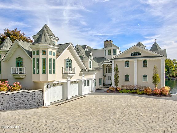 Enjoy breathtaking waterfront and mountain views from this spectacular 7100 sq ft custom home on Lake George, Queen of American Lakes! Featuring 103 ft of direct lakefront with sandy beach, boathouse for 2 boats, with 1 lift for up to 35' boat, bubblers, two jet ski lifts and mooring for additional watercraft. First floor primary wing~ floor to ceiling windows from all rooms lake side~architectural moldings and woodwork throughout~granite floors~solid surface countertops~ mahogany doors~floors & arches~security system~central vacuum~ Cali Closet system~many NEW updates in 2021 including entire exterior landscape~hardscape in techno block~retaining walls~ pillars~torch lights~propane fire pit~wood burning fire pit~sprinkler system~generator. Agent to accompany.POF required.