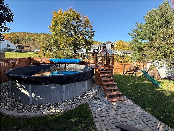 Above-ground poolPrivate oasisNewer pergolaFully fenced backyardExpansive back deckAttached two-stall garageLarge family room