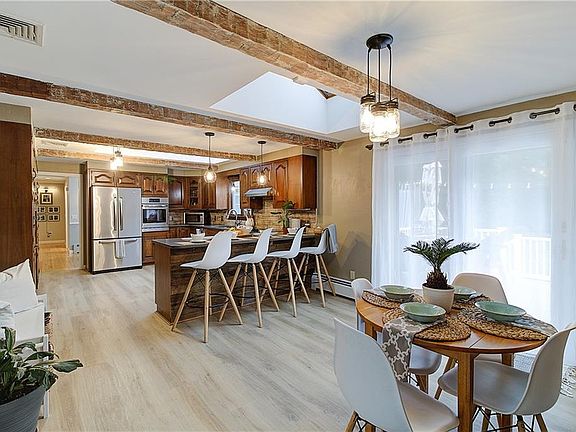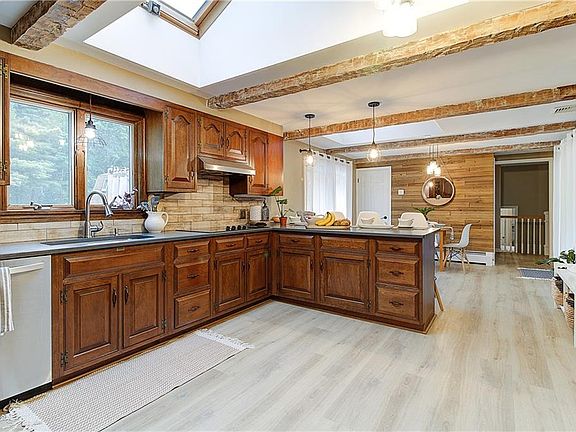 Step inside this spacious single-level home and be greeted by the warm ambiance created with carefully curated design elements that seamlessly blend modern rustic charm with earth tones. Natural materials, such as reclaimed wood, stone accents, and exposed beams, harmoniously creating a peaceful and inviting atmosphere along with updated, contemporary finishes. Large windows and skylights flood the space with natural light, highlighting the rich textures and earthy hues throughout. Beautiful cabinetry covering the kitchen blends functionality and style, along with adjacent dining area, perfect for both intimate dinners and large festive gatherings. The living room invites you to unwind, complete with a cozy fireplace, perfect for chilly evenings. As you venture outside, discover your expansive beautifully landscaped yard with lush greenery, a variety of mature trees and enjoy peaceful moments on back patio, sipping your morning coffee and watching deer and rabbits’ play. Property features a two-car garage/barn, with a versatile finished living area that can serve as a home office, a cozy reading nook, or even a home theatre, allowing for endless possibilities. Don't miss the opportunity to make this updated and modern rustic retreat your own. Experience the seamless blend of comfort, style, and natural beauty that this exceptional property has to offer. Schedule your private tour today.