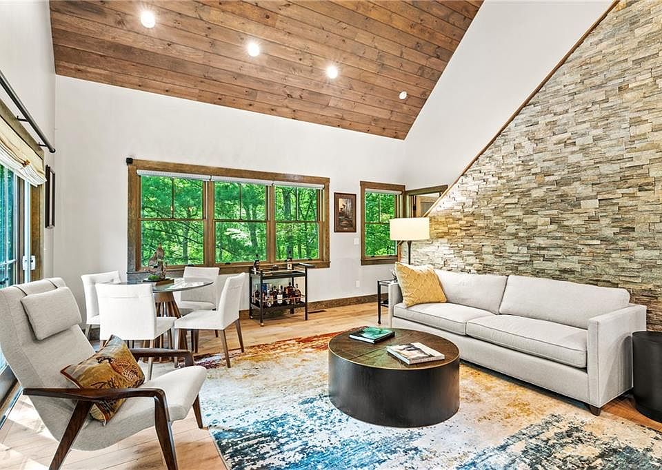 Floor to ceiling fireplaceDramatic cathedral ceiling