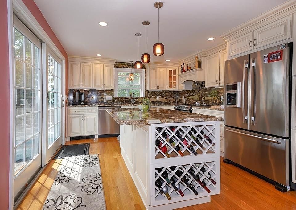 - Kit Dscrp: Main Level, Flooring - Hardwood, Countertops - Stone/Granite/Solid, Cabinets - Upgraded, Deck - Exterior, Kitchen Island, Open Floor Plan, Recessed Lighting, Countertops - Upgraded, Remodeled, Window(s) - Bay/Bow/Box, Pot Filler Faucet, Exterior Access, Wine Chiller