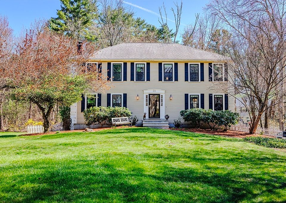 Welcome to 23 Willow Ridge Rd, a classic 4 bedroom, 2.5 bathroom center entrance colonial with great access to the city and nature alike. The first floor has a great floor plan for entertaining with an eat-in kitchen with stainless steel appliances and granite, a dining room with beautiful wainscotting and hardwood floors, which carry into the inviting front living room. Off the kitchen you will find the family room with a fireplace, the versatile 3 season room, an updated half bath and a separate laundry room. Head upstairs to 4 spacious bedrooms and 2 full bathrooms, including the primary suite with a private bathroom and walk-in closet. This home is set back on 1.17 acres in a cul de sac neighborhood which has direct access to the hiking trails at the top of the street. Perfect commuters location with easy access to Rt 93, 95, 495, 114 and 125. Schedule your showing today!