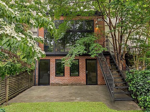The triplex is designed for easy living, with an open parlor floor that's bright and perfect for hosting. The kitchen feels both stylish and practical, featuring a huge quartzite island, custom cabinets, a walk-in pantry, and top-notch appliances (including double dishwashers and sinks). Sliding doors open to a private deck and a green backyard oasis perfect for grilling, lounging, playing or just enjoying some quiet outdoor space. There's a guest-friendly powder room right off the kitchen with a unique concrete sink and playful Gray Malin wallpaper.