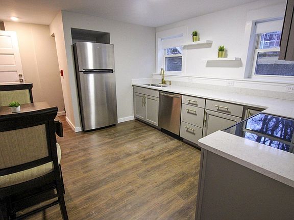 The kitchen offers gorgeous marbled quartz countertops, contemporary stainless steel appliances, and brushed nickel fixtures. The bathroom has a tiled shower, a new vanity, and a touch-activated LED mirror.