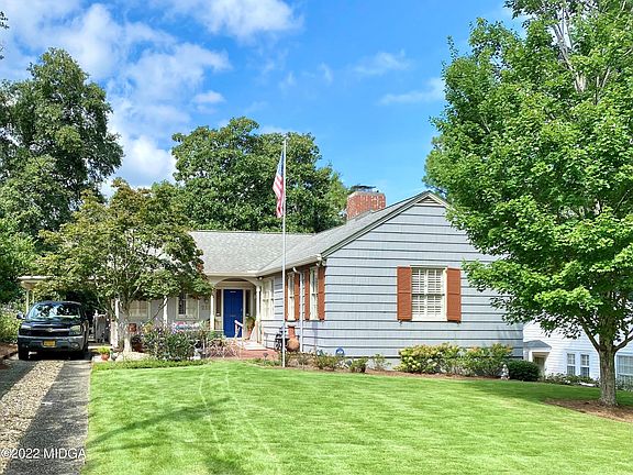 Welcome to this fantastic split bedroom floor plan home on one of the prettiest blocks in the Historic Vineville Neighborhood. Enter the home via a traditional foyer. On the right you'll find a formal living/dining room and the guest bedroom with an en-suite bathroom. On the left you'll find the primary bedroom which features an en-suite sunroom/office and hidden, private patio. The kitchen is at the center of the home and has a lucky horse shoe shape with a large picture window and gas stove. Upstairs is a fantastic den with a barrel ceiling and built in's for a potential wet bar. Downstairs is a very clean basement laundry room and work bench. Then you'll find a spacious, lovely backyard with giant magnolia and live oak trees, two car parking pad, covered patio, and great lawn. It's a wonderful retreat from the busy day and perfect gathering place for friends. This home was loved for many years by the current home owner and is ready to be loved for many years by you!