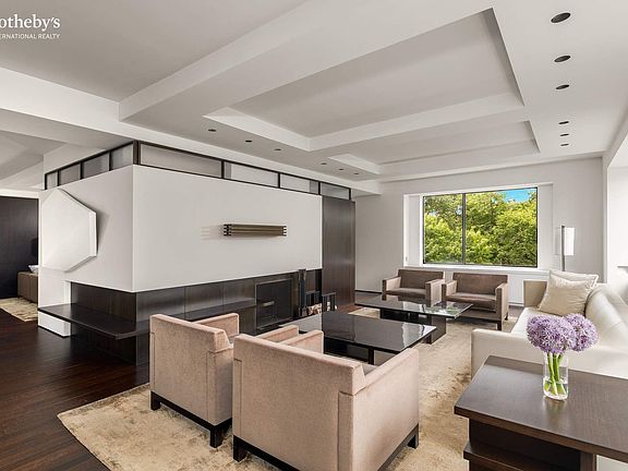 A gracious entry foyer opens to a grand gallery with Central Park views that elegantly defines the home's generous, light-filled layout. The corner great room extends beyond in a sweeping expanse, framed by oversized picture windows filled with Christian Liagre and custom bespoke furniture. With impressive beamed ceilings, a wood-burning fireplace, and intricate custom millwork, the space exudes an inviting blend of sophistication and comfort.