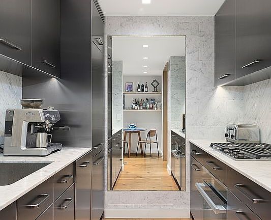 As you enter the foyer there are floor to ceiling closets with an abundance of outfitted storage space. The large kitchen with dining alcove has been fully customized with gunmetal cabinetry, Venatino marble, Miele dishwasher and wall oven, Wolf cook top and a Liebherr refrigerator. The spa-inspired bathroom features tile floors, a spacious glass-enclosed shower, and additional built-in storage.