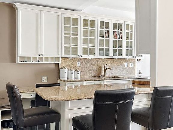 The windowed renovated kitchen has new counter tops, a Sub-Zero Refrigerator, dishwasher, and stove. Large kitchen Island allows you to have an eat in the kitchen.