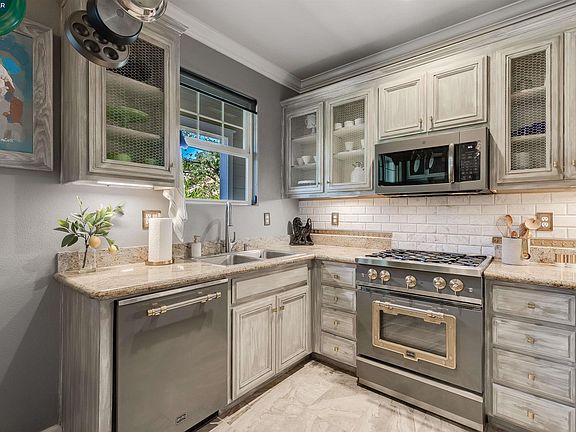 Marble floored bathroomFront and back gatesMarble subway tile backsplashCrown moldingCustom big chill appliancesRare outdoor spaceGranite countertops