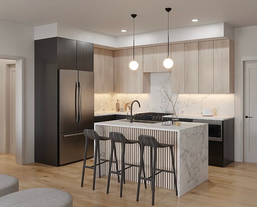 Sleek modern cabinetryHigh-quality finishesIn-unit laundryOpen-concept layoutCalacatta laza quartz countersCommon green spacePella windows