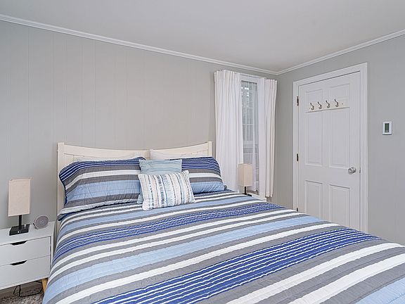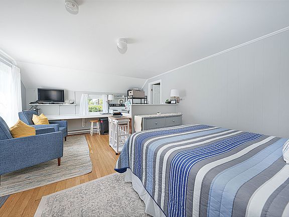 This cozy studio cottage offers air conditioning and is comfortably furnished and features a small kitchen featuring a stove and oven, microwave, full size fridge, toaster, and coffee maker. This cottage has a queen bed and a sitting area for two. Max occupancy 2 adults.