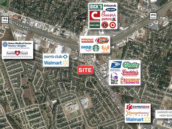 230 Millers Crossing, Harker Heights, TX 76548 is a 1.35-acre commercial parcel (Lot?5B in the National Bank Addition Commercial Subdivision) zoned B-4 for office or retail development . Strategically positioned along E FM?2410 (Knight's Way) near its intersection with US-190 (I-14), the site offers superb visibility and accessibility. Its convenient location attracts high traffic volumes from the bustling Market Heights shopping district. The parcel is fully platted, making it ready for immediate development including office, retail, or even a drive-thru format for food service. It's a level lot with access to on-site sewer and ideal for professional offices or commercial buildings Bell County records confirm the acreage and zoning, and local demographics show a fast-growing population of nearly 10,000 within one mile—growing by over 10% through 2029—with average household incomes of about $79,000 in the immediate area . In summary, 230 Millers Crossing presents a prime commercial real estate opportunity in the heart of Harker Heights: a fully prepared, high-traffic, and rapidly expanding market location perfect for retail, restaurants (especially drive-thru), or office development.