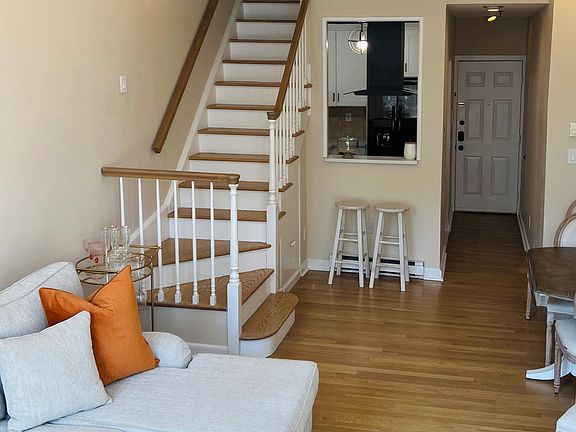 Downtown Hoboken home features a new gourmet kitchen with stainless steel appliances, including a dishwasher, refrigerator, microwave, and a sleek tile backsplash. Bathed in natural sunlight from its east-facing orientation, this home showcases refinished hardwood floors, 12 ft vaulted ceilings, and a private balcony off the main living area. The upper level offers a private bedroom, updated bathroom, and ample storage with five closets, two being walk-ins. Recent updates include a renovated bathroom and added closet installations.