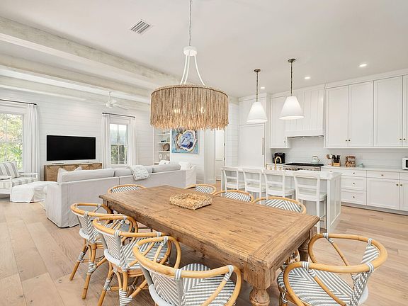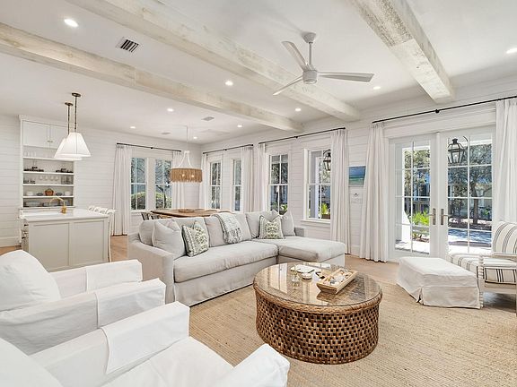 230 Needlerush is an immaculate home in the ever popular beachside community of WaterColor. The home has been completely reimagined and now features a layout that flows seamlessly from one room to the next. The new design elements, finishes, fixtures and artwork create a home that is the epitome of coastal chic; luxurious yet comfortable. No surface was left untouched during the process. The front porch welcomes you into the great room featuring shiplap walls, custom beams and local artwork. Light washed wide plank hardwood floors along with custom white drapes add to the light feel of the home. The Currey & Co. chandelier is a beautiful accent piece for the dining area. The Fulgor Milano appliances are a unique combination of style and function. This room is set up perfectly... for enjoying time at the beach together.