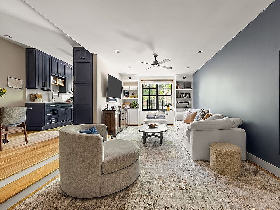 The glorious Art Deco co-op building that is 230 Park Place -- in PRIME Prospect Heights -- now offers a meticulously gut-renovated two-bed, two-bath apartment. Stripped to its ribs, this apartment was reimagined and rebuilt with both integrity and style. The capacious layout of over 1,300 sq.ft. offers endless possibilities for furniture arrangement (bring on the biggest sectional and TV!). Enter 2J: two closets and space for a bench to put on or take off shoes, drop mail, and regroup before coming or going. The sunken living room has built-in shelves and cabinets flanking its double bay, as well as an area that works perfectly as a dedicated home office. The windowed galley kitchen is refined and functional, with ceiling-high Kraftmaid cabinets finished in a handsome marine blue with brushed chrome hardware; expansive Quartzite countertops; and a suite of Bosch & GE appliances, including an electric double oven. The adjacent dining area easily seats six with chairs and/or a banquette. Two oversized bedrooms are set off from the common areas for privacy and serenity. The primary suite has a pristine bathroom with a marble-topped vanity, heated floors and step-in shower, and a fully outfitted walk-in designed by California Closet. The guest bath also has a marble-topped vanity, as well as a tub and shower. The apartment has four additional closets, refinished white oak floors, new windows in stained white oak with marble sills, and pristine skim-coated walls.