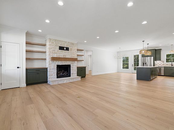 Stone fireplaceBrick exteriorPremium tile backsplashGas rangeCustom cabinetryQuartz countertopsWalk-in pantry
