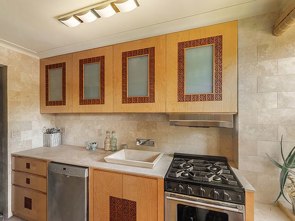 Step inside to discover refined finishes throughout limestone tile walls and floors, custom birch doors with intricate inlays, and graceful archways that bring warmth and sophistication to every space. The windowed kitchen is outfitted with custom birch cabinetry, stainless-steel appliances, a gas range, dishwasher, and Bosch refrigerator/freezer. Both oversized bedrooms offer generous closet space, and the elegantly appointed bathrooms add a touch of spa-like luxury.