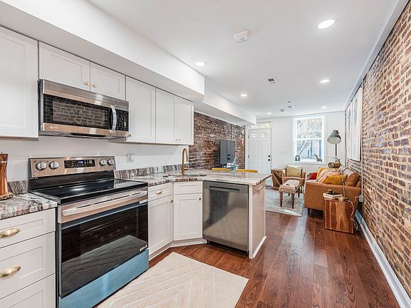 Modern vanityOriginal exposed brickModern vibeSmall private patioStainless steel appliancesNew hardwood floorsBrand new kitchen