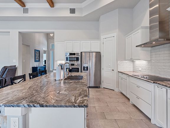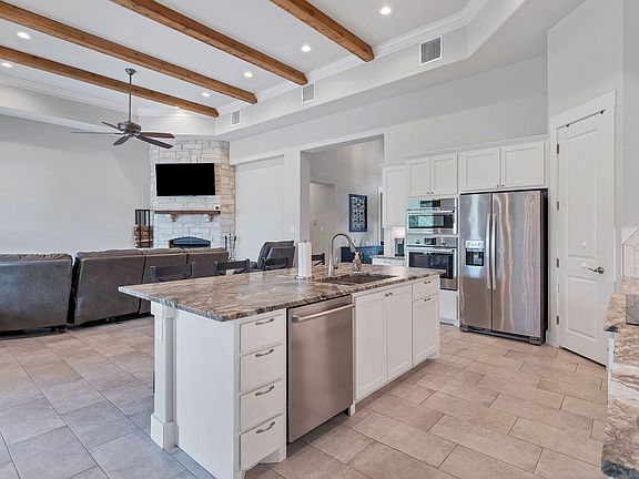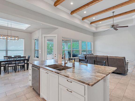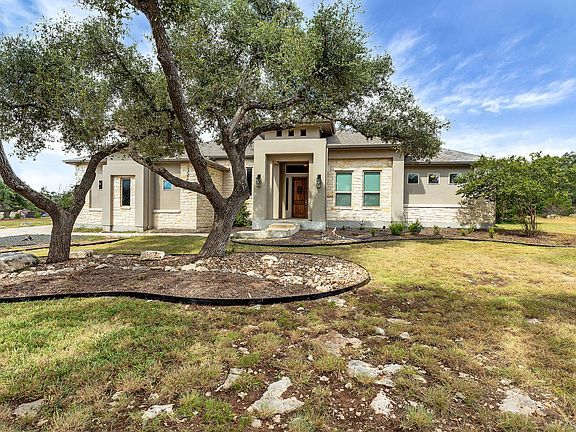 Stunning Home in Cascada at Canyon Lake! This beautifully designed home offers the perfect blend of functionality and style. A dedicated office with double French doors provides a quiet space for work, study, or play. The open-concept living, dining, and kitchen area is ideal for entertaining, featuring a large island, granite countertops, stainless steel appliances, double ovens, generous cabinet space, and a walk-in pantry. The spacious owner's suite is a true retreat with private patio access and a luxurious en-suite bath complete with dual vanities, a soaking tub, separate walk-in shower, and an oversized custom closet. Stylish finishes like wood ceiling beams and a stone fireplace add warmth and character throughout the home. Step outside to enjoy the expansive covered patio-perfect for relaxing or hosting guests. Located in the desirable Cascada at Canyon Lake community, this home offers both comfort and charm in a serene Hill Country setting. A must-see!