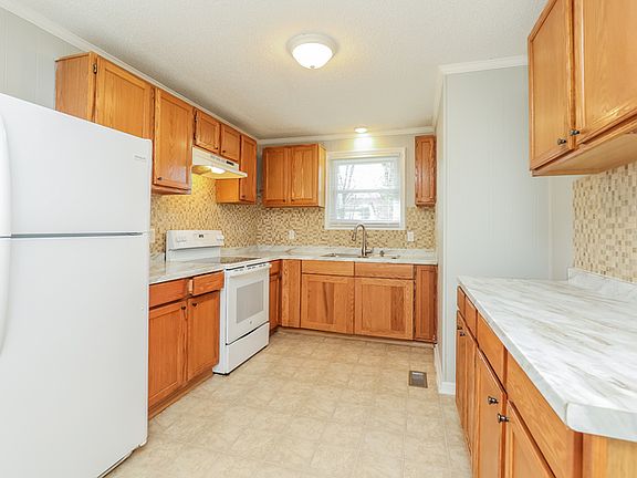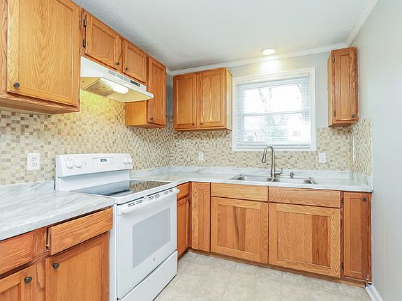 The kitchen offers a functional layout with oak cabinets, white appliances, and a window over the sink that brings in natural light. It also connects easily to the laundry room, making daily routines more efficient. The bathroom includes a shower-tub combination and a vanity sink with storage, offering both practicality and style.