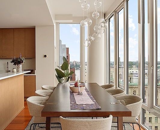 The open-concept chef's kitchen features a comprehensive Miele appliance suite, a Viking refrigerator, a wine refrigerator, and ample counter and cabinet space. The kitchen island is suitable for dining or entertaining gatherings. The kitchen also accommodates a dining table for six to eight persons, with western-facing windows offering views of the Hudson River, perfect for enjoying sunset dinners.