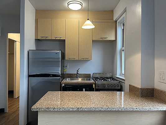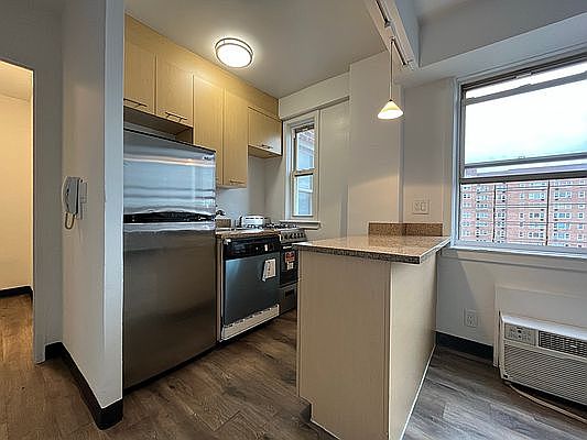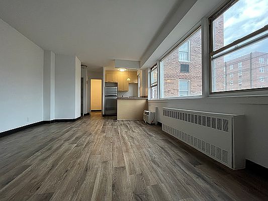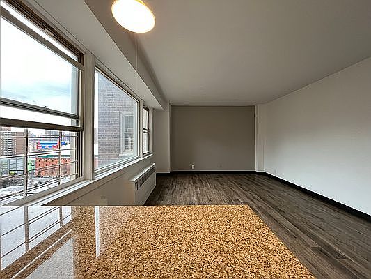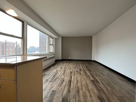 Spacious studio with large windows, lots of light and gorgeous view! Three closets. Living area 15'x12' (not including kitchen, bathroom, closets). Dishwasher.