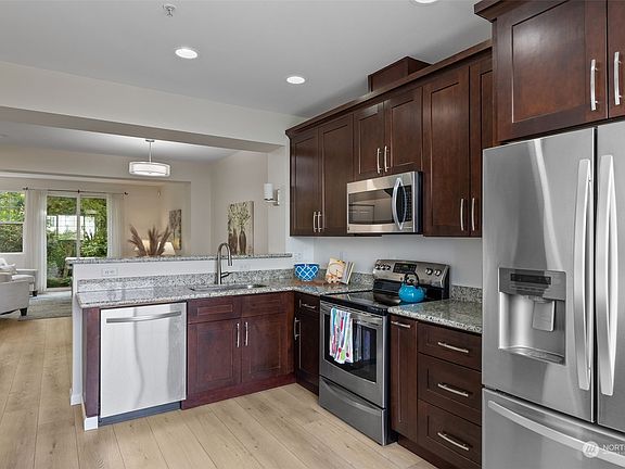 Presenting a spacious townhouse beautifully updated with modern finishes! This home is ready to move in and enjoy. Brand new vinyl plank flooring, plush new carpet on the upper level, fresh paint throughout. Colors & materials thoughtfully selected to create a warm & inviting atmosphere. The spacious open kitchen boasts granite countertops and upgraded cabinets. The dining space has ample room for any size table. The living space with shelving, perfect for displaying cherished moments. Sliding door opens to your patio with greenery, completing the main floor nicely. 2-car garage with plenty of storage space. This home is ideally located near Hwy 167, 405, Renton, Southcenter, & SeaTac. Well run HOA, manageable dues, no special assessments!