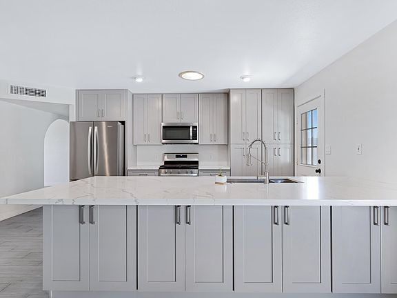 The heart of the home is a stunning, fully renovated kitchen. It boasts sleek light gray cabinetry, sparkling white quartz countertops, and a generous kitchen island with a double sink, perfect for meal prep and casual dining. Top-of-the-line stainless steel appliances, including a French door refrigerator, built-in microwave, and gas range, complete this culinary dream. The open layout ensures you're always connected, whether you're entertaining guests or enjoying a quiet evening at home.