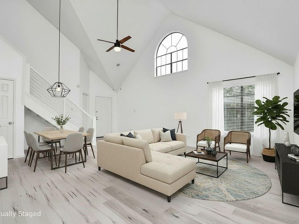vinyl flooring throughout to go along with its existing tile in kitchen/bathroom, new carpet on the stairs, paint, lighting, blinds & Heating/Cooling system.