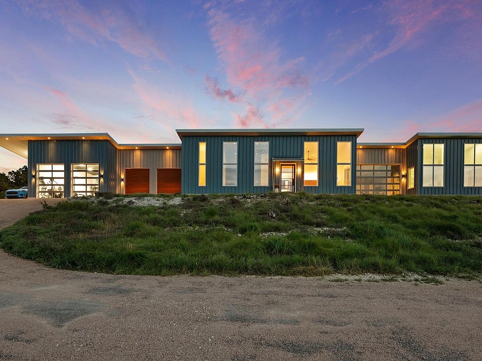 Perched high in the Hill Country, this custom-built home offers panoramic views from every angle — blending sleek, industrial design with natural beauty and comfort. The home sits atop of a mesa on 5 acres and was built with premium finishes, smart technology, and thoughtful features designed for comfort and convenience. The chef’s kitchen stuns with a one-of-a-kind 10'x4' Atlas granite island, Bosch appliances, soft-close cabinetry, under/over/in-cabinet lighting, and a countertop-height glass garage door opening to a breezeway—perfect for entertaining. Tucked just behind the kitchen, the spacious butler’s pantry adds seamless convenience — complete with extensive storage and ample counter space. The primary bathroom is a true retreat, where bold design meets serene luxury with a show-stopping wet room with 16-foot ceilings, large-format tiles. The shower includes heated floors, a soaking tub, and Brizo Litze fixtures cleverly placed so you never have to reach through cold water. The “hobby room” currently set up as a gym, provides an additional 660 sq. ft. of finished and air conditioned space for whatever custom needs you may have. It’s complete with a solar-ready mini-split HVAC system, 17’ ceilings with two 10’ x 8’ glass garage doors and concrete floor engineered for car lift use. Additional house-wide upgrades include: premium Brizo Litze fixtures, Toto toilets (with bidet outlets), and Fittes flush-mount air vents reflect attention to every detail. The land is still "raw", so plenty of opportunity to customize as you like or leave natural. Whether you're working, relaxing, or entertaining, this home is designed to inspire; grounded in nature, elevated by design. This is not just a home; it’s a modern lifestyle retreat.