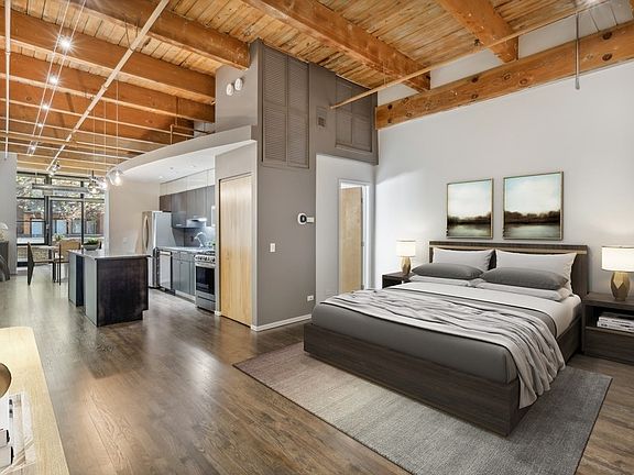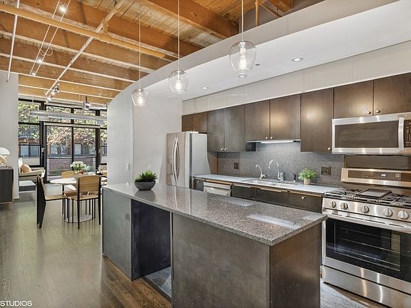 *Showings begin the afternoon of 5/4/23. Architect- owned 2BR/ 1.1 BA timber loft at the iconic Clock Tower Lofts in Bucktown boasts more than $45,000 in upgrades! Sunlight filters across the canopy of 60 ft trees & spills through the curtain wall of windows in the Living Room, which is anchored by a marble- clad fireplace. The Kitchen features aniline- dyed cabinets topped by granite counters & a suite of newer stainless LG appliances in addition to a reverse osmosis water filter. A Dining Area connects the Kitchen to the Living Room for seamless entertaining. The Primary Bedroom features a 12- foot wall of organized closets faced in reclaimed wood with custom- fabricated steel pulls. Additional cabinets above the closets offer even more storage. Second BR features the architect's custom- built design studio composed of a radius- cut desk & shelves, but these can be removed easily. An additional photo shows this space as the 2nd bedroom with a queen- size bed. Furnace, AC & Hot Water tank all replaced in last couple of years. Oak hardwood floors throughout were just refinished & are the perfect backdrop for your furniture & art. Includes deeded, heated parking in the attached garage as well as a walk-in storage closet. Professionally managed building features a three- level exercise room & a large, furnished roof deck with a gas grill & panoramic skyline views! Almost $900K in reserves, no specials & 80% owner occupancy. Assessment includes cable/ internet. Steps to the best dining, shopping & nightlife of Bucktown & Wicker Park, one block to the 606 & 2 blocks to the Blue Line!
