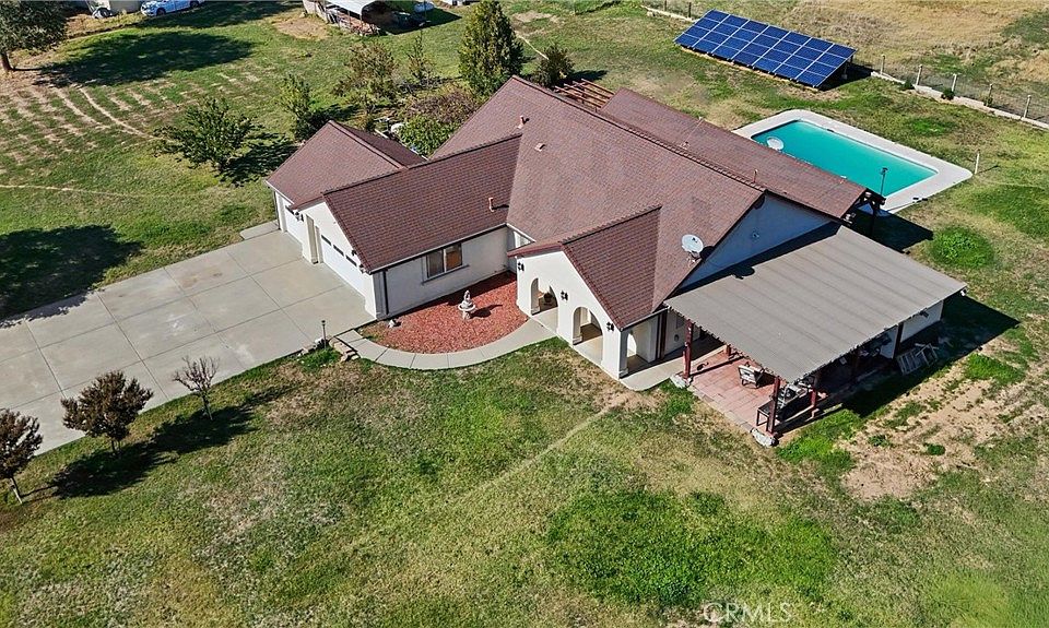 Additional highlights include an electronic gated entrance, paved driveway, 3-car garage, carport, shop, storage room, garden stall, and owned solar for energy efficiency. Whether you’re relaxing poolside, tending to your garden, or enjoying your own mini-orchard, this property is the perfect place to call home.