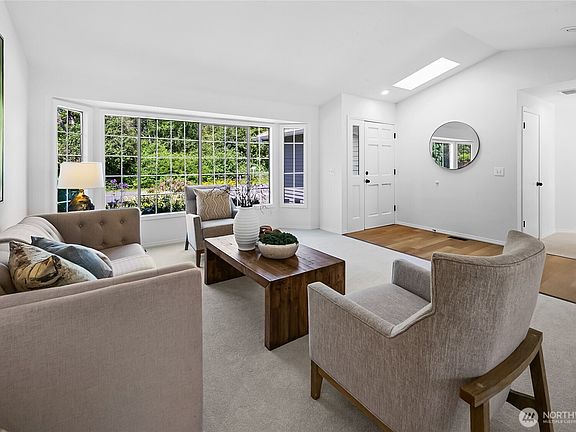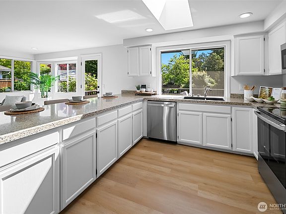 Sweet as honey, thoughtfully detailed, 1811 sq ft, one-level home with an open, sunny disposition on a fantastic level lot on a quiet street. Natural light pours in through five new skylights and a bright, open kitchen w/granite counters & new stainless appliances elevates the aesthetic. New vinyl plank flooring, plush new carpets and central A/C simply add to the cool factor. Formal dining room, quiet primary suite, plus 2 more bedrooms, a 2nd full bath and a sunny family room. A massive Trex deck overlooks an expansive fully fenced & beautifully landscaped yard w/sprinklers for easy maintenance. Sits right across the street from a native growth protection area and in the Northshore School District. Big 2 car garage and space for your RV.