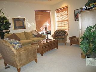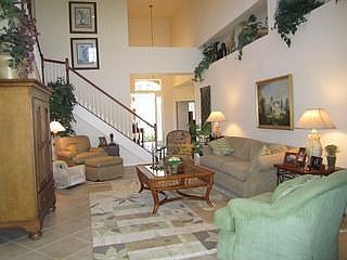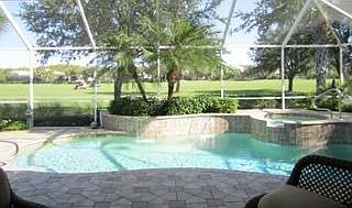 Exceptional 2 story Kingfisher offering 3 bedrooms & den or 4 bedrooms, your choice.Lanai faces fairway 12 on the south course. VERY PRIVATE. Gourmet kitchen has raised panel custom cabinets, undercabinet lighting & tumbled marble backsplash. Plantation shutters thoughout, central vac, intercom, built-in ironing board, beveled mirrors, water softener ;system. Upper level has huge loft and 2 bedrooms and bath with dual sinks. Large paver stone lanai with heated pool & spa. Night lighting on front and back of home.