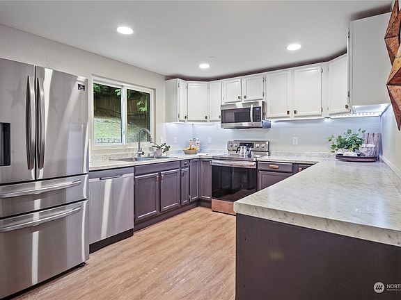 This 1-story home offers flexible living space to fit your lifestyle. Meticulously maintained 3-bedroom home with 2 full baths, wood fireplace & attached 2-car garage. Extensive upgrades include LVP flooring thru-out, Central Air-Conditioning, updated kitchen & bathrooms, stainless steel appliances, new lighting, wood trim, doors & paint--all contribute to a modern & inviting atmosphere. Energy efficient Triple-pane windows block out noise. New gutters. Fully fenced & private back yard has large deck & terraced yard—a canvas for gardens & outdoor play adventures. Loads of loft storage in garage, you can skip the mini-storage bill. Situated on a cul-de-sac, the home provides EZ access to I-405 & Bothell Hwy & desirable Northshore Schools.