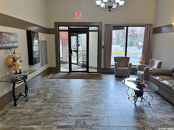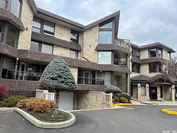 Enjoy the convenient location of Chalet Gardens with Market Mall across the street, and all the amenities this condo has to offer. This well cared for condo features 1,250 sq ft of living space, two bedrooms, two bathrooms and a large living room/dining room area. The spacious primary bedroom features a large walk-in closet and large shower with seat in tub. The kitchen includes all appliances and has room for table and chairs. Enjoy in-suite laundry, central air conditioning, and new intercom system monitoring front door. The large east facing balcony includes extra storage space with shelving. The building includes underground parking, stall #56, with storage space and a wash bay for your vehicle. Also included is a large amenities room, elevator, woodworking shop and RV parking. The manicured grounds feature an abundance of mature trees and shrubs making this a beautiful place to call home.