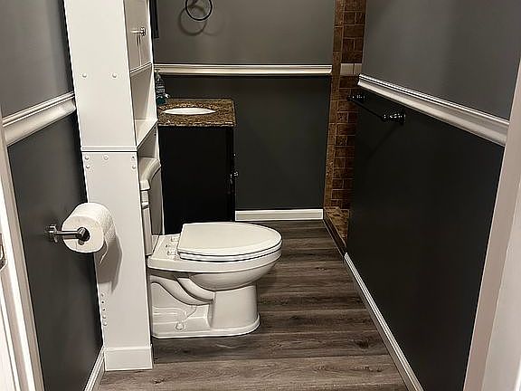 It has a tile walk-in shower. The half bath has access from the house or the shop either one.