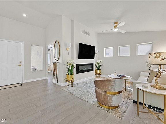 Charming fully renovated two bedroom, two bathroom townhome with custom finishes. Spacious open floor plan with split living bedrooms, elevated ceilings, lots of natural light, two car garage with storage and mature landscape. Designer kitchen with custom cabinets, stainless steel appliances, farmhouse sink, brass hardware with wine storage. The home has engineered wood flooring, statement lighting, two-tone paint, electric fireplace, window coverings and an enclosed patio. Sun City Summerlin is an age restricted community with three golf courses, club houses, swimming pools, fitness classes and a full activity social calendar. Located in close proximity to Red Rock Casino, Downtown Summerlin, Tivoli Village, Boca Park, restaurants, doctors and hospitals.