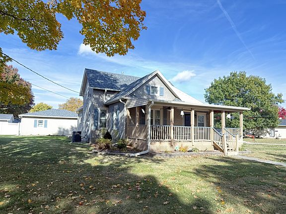 Very well maintained and welcoming, this spacious 3-bedroom, 2-bath home offers comfort and charm throughout. The large kitchen features Corian countertops, a center island, stove, refrigerator dishwasher and microwave included plenty of wood cabinets. The kitchen opens to the dining area and living room where a cozy fireplace, tray ceiling, and recessed lighting create a warm, inviting atmosphere. Solid wood doors and newer windows add timeless appeal. The main level also includes an office/computer room, a first-floor primary bedroom, convenient laundry area, and a full bath. Upstairs you'll find two nicely sized bedrooms with large closets, a 11'x12' storage area, as well as a charming full bath complete with a beautiful original claw-foot bathtub. The full basement includes an updated electrical panel and a walk-out door for easy access. Back porch has a built-in bench with storage. Enjoy and relax on the lovely covered front porch featuring composite decking and a ceiling fan. A two-car garage and corner lot provide extra space and curb appeal. Additional updates include a newer furnace and A/C, roof approximately five years old, gutters replaced in June 2021, and a new water heater installed May 28, 2025.