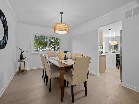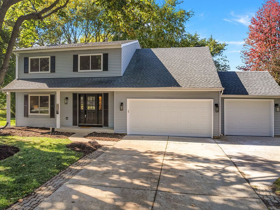 COMPLETELY RENOVATED with 4 CAR GARAGE! This stunning 4 bed, 2.1 bath home in Springbrook Crossing offers brand-new Mohawk engineered hardwood flooring, lighting, paint, and high-end finishes throughout. Step through the covered front porch into a refreshed interior where the formal living room flows into the dining room with a stylish light fixture and continuous new flooring. The chef's kitchen features stainless steel appliances, two-tone cabinetry with 42" uppers, quartz countertops, a waterfall island, custom backsplash, and updated lighting. Sliding doors from the eating area open to a newly refinished deck are perfect for indoor/outdoor entertaining. The family room impresses with a vaulted ceiling, skylight, and a refreshed floor-to-ceiling masonry fireplace. A new powder room and laundry room complete the main level. Upstairs, the primary suite offers a vaulted ceiling and walk-in closet. The fully renovated en suite bath boasts a cabinet vanity with gold-toned hardware and fixtures, a custom-tiled shower with gold-toned waterfall showerhead, tiled niche, and glass doors with marble transition piece. Three additional bedrooms with new flooring and paint share another beautifully updated full bath. The finished basement provides a spacious rec room, office/den, and ample storage. Brand new Mohawk Designer Collection carpeting in 2nd floor and basement. Outside, enjoy refreshed landscaping, a new concrete walkway from the garage to the backyard, and plenty of green space. The rare 4-car garage (2-car plus 2-car tandem) provides excellent storage or workshop space. Both garage doors and garage door openers are brand new and equipped with MyQ for wifi enabled garage door use. Move right in and enjoy modern luxury in this beautifully renovated home!