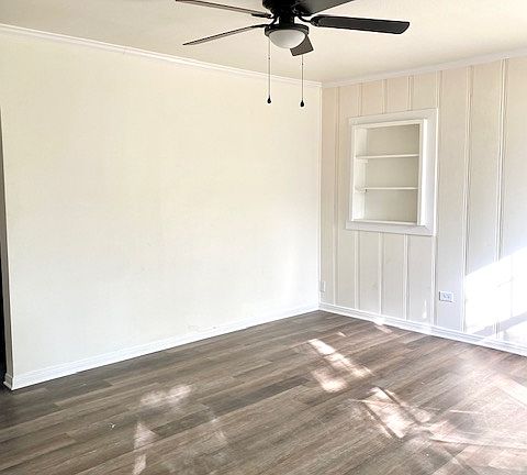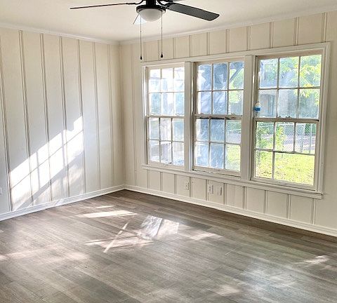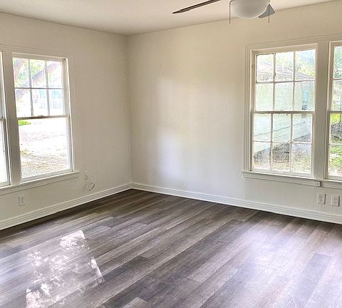 New appliancesVinyl plank flooringDining roomCeiling fansSpacious bedroomUnfenced backyardLaundry room