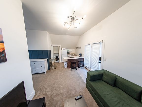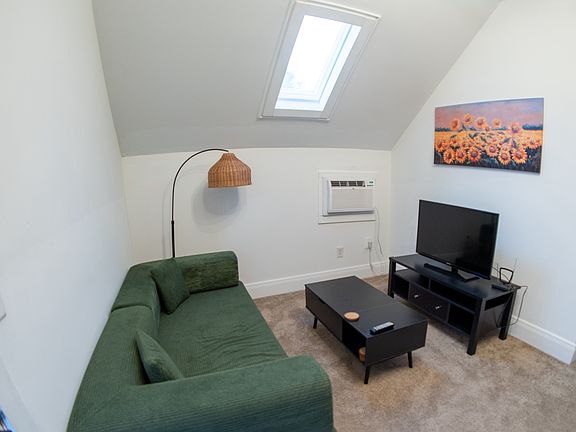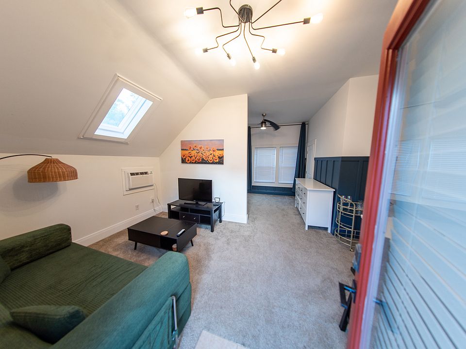 Beautiful carriage house with upscale details. It is a studio, but has a wall separating out a living room. There is a full kitchen, washer/dryer, and large closet. The apartment has upgraded light fixtures, Wayne's coating, and tons of sunlight from big windows and a sky light. Small private deck overlooking the yard. Situated above a garage with a sunflower mural.