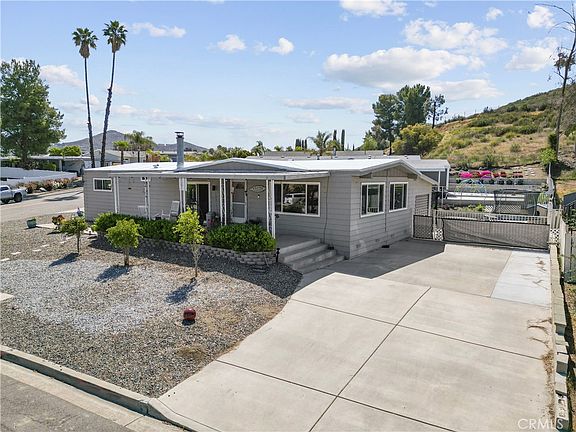 Welcome to this extremely maintained adorable double wide mobile home in the Canyon Lake Mobile Estates. Bring your RV and toys! This mobile sits on a large corner lot with 2 separate driveways with one side that has a 30 AMP and water hookup. The back yard is big enough to host outside gatherings, it has new artificial turf, a relaxing gazebo area and a covered patio . Inside this home has drywall ceilings, inside laundry has gas dryer with barn doors, walk-in pantry, remodeled front bathroom, kitchen was redone, windows were upgraded and replaced, roof was redone, ceiling fans throughout and the sellers earthquake proofed the foundation on brackets. When you move into Canyon Lake you also have access to the lake, golf course, parks, beaches, tennis courts, pickleball courts, Lighthouse Restaurant, community pool, equestrian center and Happy Camp.. Yes, there is a campground in the community! And so many more fun activities that the community host yearly. Owner's are also willing to sell furniture if your buyers like what they see. All information is deemed reliable but not guaranteed.