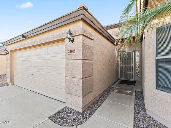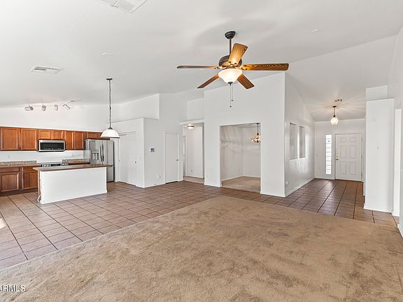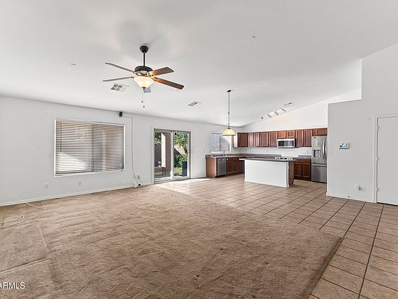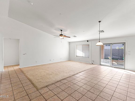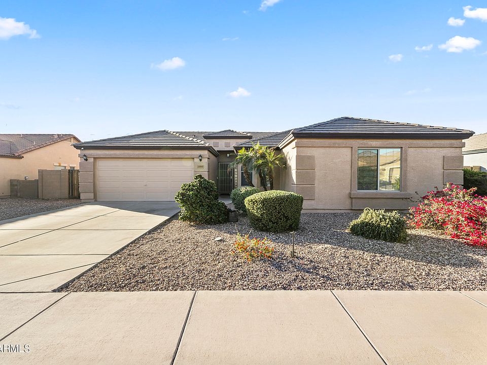 Beautifully designed single story home featuring 5 bedrooms & 3.1 Bathrooms, including dual primary suites! This spacious floor plan offers an open great room layout with vaulted ceilings, ceramic tile flooring, and elegant Tahoe Cherry cabinetry. The kitchen shines with a large island and breakfast bar, updated stainless steel appliances, and a generous double-door pantry. The primary suite features dual sinks, a soaking tub, and a walk-in closet, with a split-bedroom layout offering added privacy. New Andersen windows & a sliding patio door, while the garage provides built-in cabinets for plenty of extra storage. Step outside to a backyard retreat complete with an extended covered patio, professional landscaping, & a fenced play pool with a boulder-style waterfall. With room for everyone and a location just steps from the community park, this home is the perfect blend of comfort, space, and Arizona living.