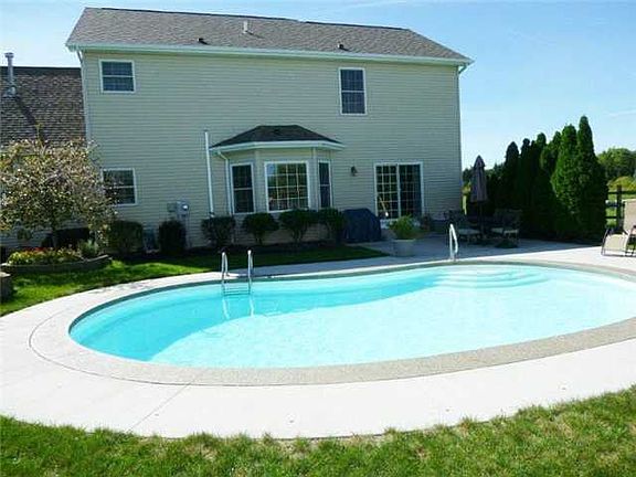 Vacation all year in this 4 BR/2.5 BA home built in 2005 which has a Mossing heated in-ground pool! Well landscaped for privacy, Wood floors on 1st floor, Eat-in kitchen has bay window, island, S/S appl. & 2 pantries. Living room has fireplace w/blower & transom windows, Master suite has a walk in closet & attic, Jacuzzi tub, separate shower & 2 sinks. Finished bsmt., sprinkler & alarm systems. Several rooms have cat 5e ethernet outlets for wired computer connections. Will install new carpet and leave existing appliances. Also includes a sectional sofa with electronic recliners, a big screen television, a dining set, and a Ring smart video doorbell at no additional cost. Priced to move quickly; $28,500 below the zestimate, and well below the average comparable price from a local market analysis.