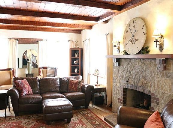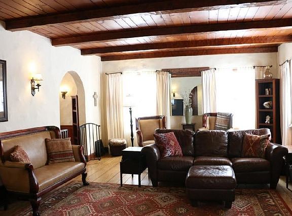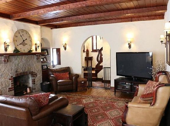 This charming four bedroom Mediterranean Revival home has a distinctive tile roof, custom balcony overlooking the front of the property, and an arched front entry with a parapet wall sweeping up to a tower-like chimney. Arched doorways and ceilings continue as a theme throughout the home. The living room is warm and spacious with sconce lighting and stone fireplace, and opens through an arched entry to the formal dining with a beautiful barreled ceiling. A built-in buffet leads to the cozy kitchen, which features an opening to the large sunroom with expansive windows looking out into the landscaped yard. A new curved paver patio and walkway add outdoor living space. The roof is new as of 2014. Soft adobe plaster walls, stone tiles, wood beamed ceilings, barrel vaulted ceilings, stone fireplaces, leaded and stained glass, sconce and lantern lighting, and random width plank oak flooring are some of the architecturally significant details.
