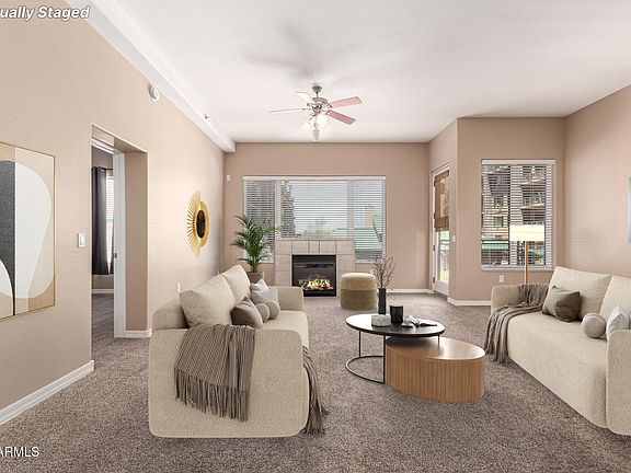 Become the proud owner of this stunning 2-bedroom unit in the Tapestry on Central! Discover a tranquil living room with a soothing palette, blinds, soft carpeting, and an inviting fireplace for cozy evenings. The well-appointed kitchen comes with granite counters, a pantry, recessed lighting, built-in appliances, and a two-tier peninsula with a breakfast bar for casual dining. You'll also find a den with contemporary track lighting, offering a versatile space for work or relaxation. The tranquil primary bedroom features a walk-in closet and a private bathroom with double sinks for an efficient daily routine. Unwind on the charming balcony, boasting serene views of the surroundings. Ideally located close to downtown Phoenix, restaurants, shopping, and entertainment. Make this gem yours!